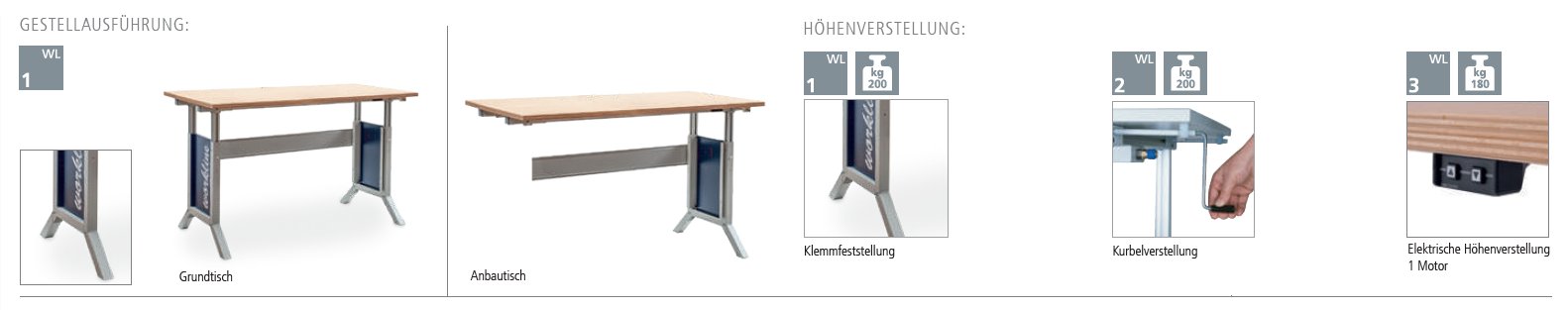 - alle Tische stufenlos höhenverstellbar von 735 bis 1100 mm Untergestell aus Stahlrohr 45 x 45 mm, Traversen aus Alu-Profilen 40 x 40 mm